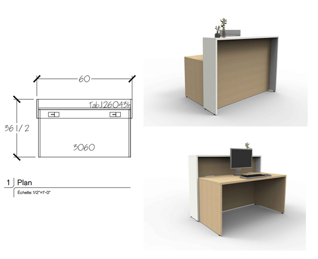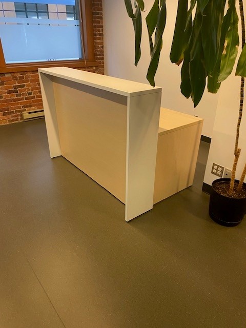 Meuble de Réception de 12' profondeur x 60'' L x 42''H. Surface et patte couleur Very white, façade: choice Maple.